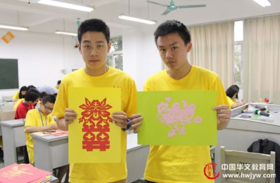剪纸是中国民间艺术的典型代表,其深厚的文化底蕴、美观的造型设计激发了营员们浓厚的学习兴趣。记者来到剪纸课教室,看到活泼的营员们此刻全都安静地坐在课桌前,手拿工具,一板一眼地对着画样精心剪裁。他们时而伏案创作,时而抬头思索,专注之情溢于言表。比利时团队的周达敏同学表示,以前看到过很多中国剪纸作品,认为其创作过程一定十分复杂,但经过陈涛老师专业、细致的指导,营员之间还经常“切磋”,他现在感觉剪纸并没有想象中那么难,自己也可以创作出满意的作品了。当剪纸课结束时,同学们拿起人生中第一份剪纸作品,向记者“炫耀”。