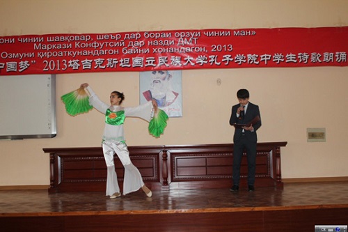 中新网11月25日电 据国家汉办网站消息,11月22日上午, 由塔吉克斯坦国立民族大学孔子学院主办,以“快乐汉语,诵出我的中国梦”为主题的2013年塔吉克斯坦中学生汉语诗歌朗诵比赛在杜尚别市KAFOLAT学校礼堂成功举行。