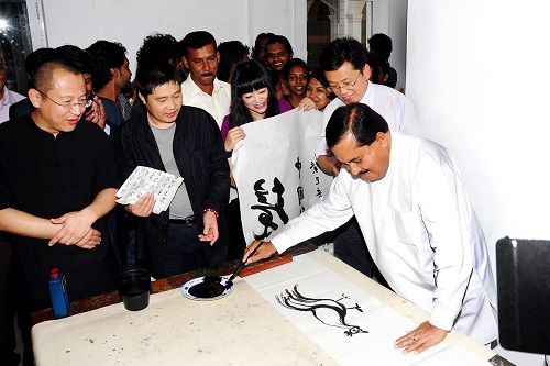 中斯两国艺术家还现场进行了书法和绘画交流,艾克纳亚克部长还兴致勃勃地用中国毛笔在宣纸上作画,画了一只斯里兰卡国鸟——原鸡,形象逼真生动,亲身体验了中国水墨艺术的情趣。