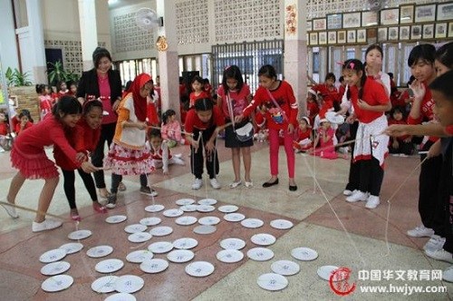 随后,“汉语接力赛”将本次活动推向了高潮。游戏设计采用“鸡蛋”做道具,蕴含“圣诞、元旦”天天快乐之意,并通过 “小猫钓鱼”让学生掌握具体的祝福语言。