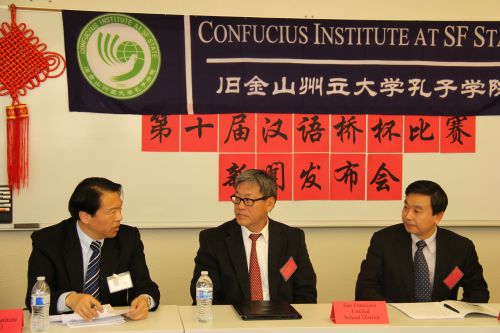 中国驻旧金山总领事馆教育参赞徐永吉、旧金山联合学区副学监David Wong, 以及比赛组委会全体成员出席了新闻发布会。孔子学院院长谢家新主持了新闻发布会并详细介绍了本届比赛的相关情况。David Wong代表旧金山联合学区祝贺第十届汉语桥杯中文比赛成功启动,并表达了与旧金山州大孔院加强合作的美好愿望。徐永吉参赞祝贺比赛成功启动,并且向参与各项筹备工作的孔子学院全体教师、湾区教师和志愿者团队表示感谢,最后预祝比赛不断提升水平,扩大规模,为中美人文交流做出积极贡献。