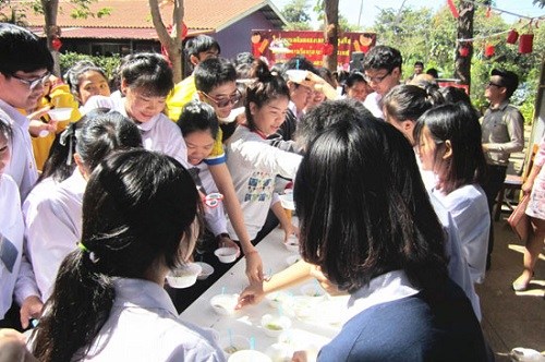 在中华手工艺体验区,剪纸、脸谱和中国结的展示不仅有详细的泰文解说,还有实物进行体验,汉语班学生还当起了中国文化的解说员,为前来体验的师生细心讲解。最受欢迎的要数中华饮食展区,汉语班学生亲自做的饺子、汤圆、港式炒面、龟苓膏等美食吸引了众多师生,展区外排起一条条“长龙”。更有中国文化知识有奖竞答,回答正确的学生可以领到红包。