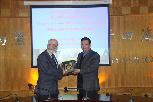 Paul Giller副校长介绍了爱尔兰国立科克大学亚洲学院/中国研究院的发展情况,并表达了与学院在汉语国际教育方面进行合作的愿望。他说科克大学亚洲学院/中国研究院越来越重视汉语国际教育,但当地的汉语教育资源十分有限,而暨大华文学院在汉语师资培训及中文教材编写方面的经验和成果可以很好地满足当地需要。此次来华,他希望通过与学院商洽开展汉语国际教育方面的交流与合作,为爱尔兰乃至欧洲的中文教育打开新局面。