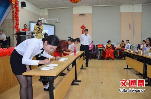 中新网4月24日电 据中国文化部网站消息,蒙古国立教育大学外语学院汉语系3年级日前牵头举办了一场丰富多彩的“汉语节”,乌兰巴托中国文化中心和蒙古国立教育大学孔子课堂代表、院校负责人应邀出席,外语学院汉语系4个年级8个班近200名学生参加活动。