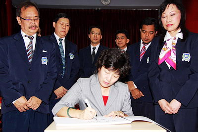 在一间极具中国传统文化特色装饰的中文教室里,章大使欣然执笔为该校题词“发展友好 教育为本”,并表示两国友好应从教育抓起。章启月还代表中国驻印尼大使馆为该校提供中文流动图书馆,以支持该校学生学习汉语和了解中国文化。