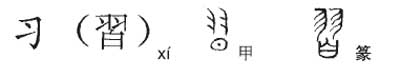 甲骨文“习”字从羽从日,羽即羽毛,代表鸟的翅膀,表示鸟儿在日光下练习飞翔的意思。《说文解字》:“习,数飞也。”所以,“习”的本义是指鸟儿练习飞翔,泛指学习、练习、复习,引申为通晓、熟悉之义,又指惯常、习惯。