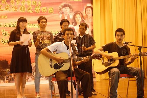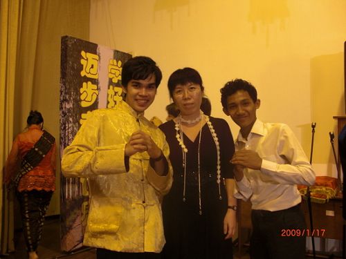 在这一年里,我们倾注最多心血的还是学生。课前,精心准备每一堂课;课堂上,耐心细致、不厌其烦地为他们讲解。对基础不好的学生,我总是给以鼓励。因此,在课堂练习时基础差的学生也从来没有退缩、胆怯过。相反,他们为自己的每一点进步感到骄傲和自豪。在这样的氛围中,每个人的华语进步都很快。马达族学生润凯没有任何汉语基础,开始他很不自信,但是在大家的鼓励下,他的汉语进步很快,在2009年春节晚会上,润凯担任了节目主持人,他标准的语音,儒雅的仪态受到大家的一致好评。还有一位马达族学生安子丘,入学前也没学过汉语,但他在学年末获得了学习进步奖。课下,我们还经常在一起谈心,学生们的喜怒哀乐都愿意和我分享,我们也像他们的亲人一样为他们分忧解难。正因如此,我们和学生建立了深厚的感情。在分别之际,同学们依依不舍,他们含泪唱出自己编写的歌:“您的爱心,您的苦心我们永不忘记,那些曾经有笑有泪美好的光阴,为了学习汉语,只为等待您。老师的爱心像河水流不停,您的爱是我最大的鼓励,老师的苦心把我们教得了不起……我会想念您,永远记住您,您对我的恩惠我不会忘记。”他们想透过华语了解华夏大地,也因为我们的爱爱上了我们,爱上了华语。