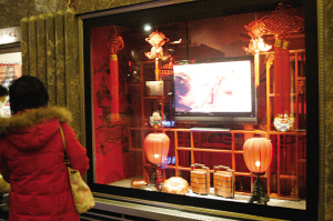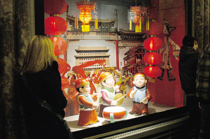 从9日开始,帝国大厦一层大厅的几个橱窗内正式摆出了各种以农历新年为主题的立体橱窗展。这些展览主要分为“辞旧迎新”、“和谐团圆”、“闹元宵”和“逛庙会”四个部分。橱窗里各种充满喜庆气氛的人物和建筑造型吸引了许多游客在前面拍照留念。