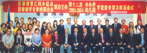 中新网2月9日电 据菲律宾《商报》报道,菲律宾晋江同乡总会联合菲律宾华校联合会于本月6日在晋总举办“第12次中小学、幼儿园华语教学讲习班”结业式,晋总理事长、名誉理事长、副理事长、理事等,连同校联诸位常务理事,正副秘书长及理事们,与华语教学督导们莅临出席。