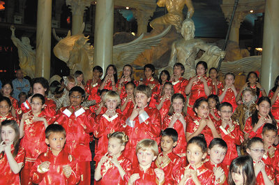 中新网2月22日电 据美国《世界日报》报道,“我的朋友在那里”、“蝴蝶”、“泥娃娃”、“恭喜、恭喜”,拉斯维加斯草原小学120名五年级和幼稚园小朋友,穿着红色中国丝绸衣裤,字正腔圆的表演中国歌曲,站在最前排的两名幼稚园生还穿上“老虎”外衣,游行时发出老虎吼。
