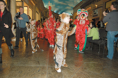 第15年带着学生到赌城凯撒宫在中国新年游行表演,凯撒宫购物中心内所有顾客和小朋友的家长亲友,高举着相机,录下这场可爱又温馨的洋娃娃贺年片段。
