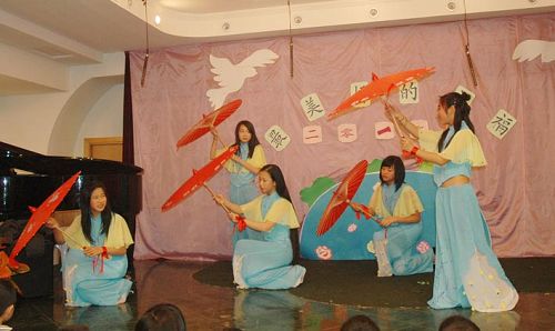 同学们在一个半小时的联欢会上表演了精心排练的节目,无论是舞蹈、童话剧、短剧、朗诵还是小品,都表现了学生们对祖国文化的热爱和对所学知识的理解。(谢培康)