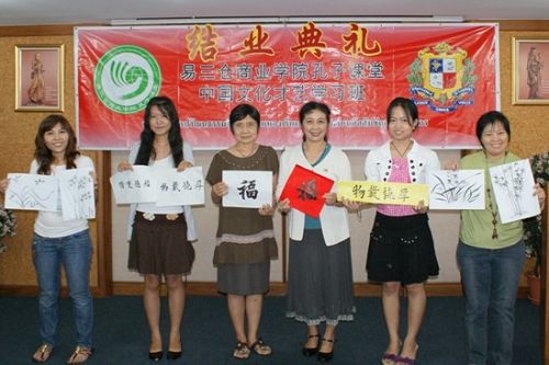 中新网3月4日电 据国家汉办网站消息,近日,泰国易三仓商业学院孔子课堂第一期中国文化才艺学习班圆满结业。本期学习班面向广大汉语及中国文化爱好者开设了古筝、二胡、书法、国画、剪纸及武术课程。经过为期4个月的学习,学员们对中国文化有了深入、系统的了解。