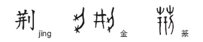 荆,是一种带刺的小灌木,枝条可以用来编筐篮。金文的“荆”本是个会意字,像一个人的手脚扎满荆刺之形;后来或加“井”作为声符,成为形声字。由于“荆”字的人形与“刀”极为接近,故金文“荆”字或讹变为从刀井声,与“刑”字同。小篆“荆”字以刑为声符而增加草头,当是从金文的讹体演变而来。