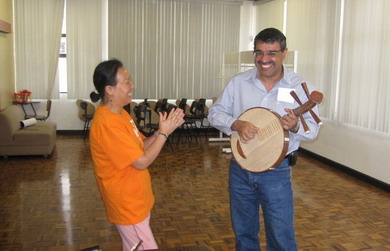 在文化周的最后一天,哥大副校长卡洛斯·罗德里格斯亦饶有兴致地来到中国文化展台观看节目,并拿起二胡模仿演奏,他还索要了自己的中文签名并与大家合影。他高兴地表示,哥大是中美州最著名的大学,在其成立的70年当中,中国文化元素的出现还是首次。他感谢大家把绚丽多彩的中国文化展示在这个古老的校园里,给它增添了新的活力。并表示,随着中国与哥斯达黎加两国关系的日益紧密,两国之间的文化交流就愈显重要,而文化周就是最好的平台。哥大将继续重视和支持开展文化交流活动,祝大家取得更大成绩。