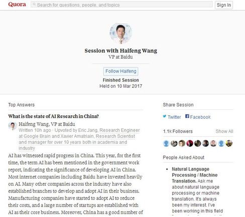 百度王海峰quora答美网友:未来搜索将无所不在