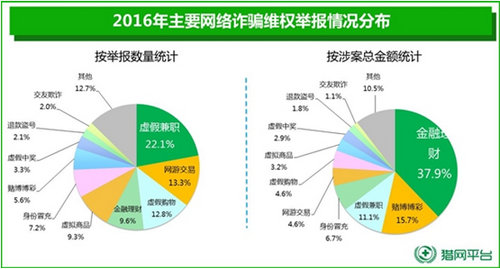 近日,360公司基于360搜索、猎网平台等产品数据,发布了2017年《中国互联网用户消费维权报告》。 该报告显示,虚假兼职依然是举报数量最多的诈骗类型,共4550例,占比22.1%;其次是网游交易、虚假购物、金融理财、虚拟商品和身份冒充。而从涉案总金额来看,金融理财类诈骗最高,达7411.4万元,占比为37.9%;其次是赌博博彩诈骗,涉案总金额占比为15.7%。
