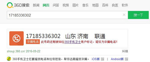 除了和360网盾平台合作之外,360搜索还与360手机卫士的海量骚扰及诈骗电话号码库,进行了紧密对接。通过对骚扰等电话进行明确标识。当用户在360搜索上搜索某个电话号码时,360搜索引擎会调取360手机卫士电话标识服务接口,针对搜索结果中含有客服电话数据,做对应判断,重点识别:骚扰、诈骗、房产中介、金融理财等电话数据,方便网友一眼识别电话来源。