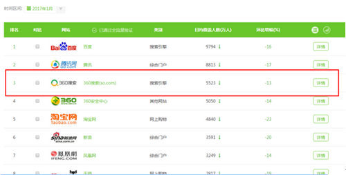 360搜索自2012年8月上线以来,凭借安全、可信赖等优势,用四年多时间,PC市场渗透率超过60%,每日搜索请求超过7亿次,活跃用户超过4亿,成为国内增长最快的搜索引擎之一。此外,根据艾瑞公布的2017年1月份PC指数数据,360搜索在日均覆盖人数方面排名全平台前三,在搜索行业位居前二,不断拉近和市场第一的距离。这也侧面说明,在消费安全日益被重视的今天,更安全、靠谱的搜索引擎越来越受到用户的青睐和认可。