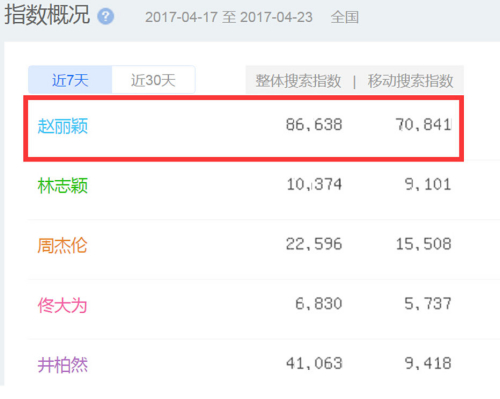 (百度指数显示,赵丽颖热度远超其它OTA形象代言人)