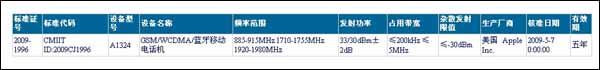 据中国无线电管理网站的型号核准查询数据库显示,在2009年5月7日,苹果公司的一款型号为A1324的“GSM/WCDMA蓝牙移动电话机”获得核准,标准证号为2009-1996,标准代码为CMIITID:2009CJ1996。由于苹果只生产iPhone一种手机(有三个版本),所以毫无疑问获批的应该是iPhone。