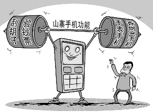 一些让人觉得不可能存在的、配备独特功能的手机,现在也在中国出现了。比如带有剃须功能的“剃刀手机”,能识别假币的手机,在科幻动画片中经常出现的道具手表也被开发成手机了。这些都是一些不出名的厂商靠创意打开销路的做法。 漫画 刘道伟