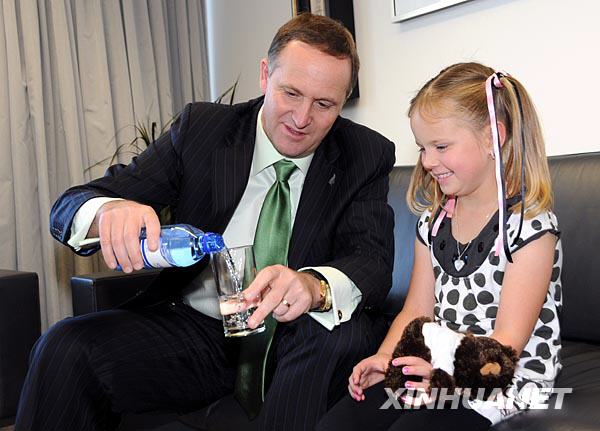 10月13日,新西兰总理约翰·基在惠灵顿的总理办公室会见6岁的环保模范布雷娜·纽曼。约翰·基当天特意邀请布雷娜到总理办公室做客,并参观议会大厦。来自新西兰北岛东部城市内皮尔的布雷娜在一次环保公益活动中成功回收了468部旧手机。新华社记者黄兴伟摄