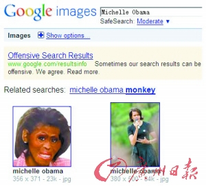 当用户通过谷歌搜索引擎搜索奥巴马夫人的照片时,一张带有严重歧视性的照片出现在搜索结果的最前列。这张照片将米歇尔面部“恶搞”成猴子形象。这对于黑色人种的米歇尔而言,无疑是最严重的侮辱方式。