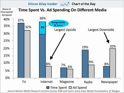 该数据为2008年数据,因此当前报纸所吸引的广告开支比例会有所降低。但考虑到人们在报纸上花费的时间如此之少,即使有所降低,那幅度还是不够。