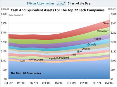 Capital IQ数据显示,这10大科技公司拥有2100亿美元现金和等价物,在过去2年中,这10家科技公司的现金和等价物增加了687亿美元。