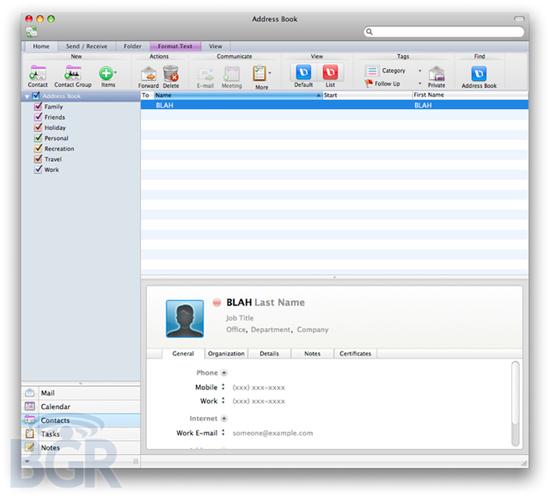 与微软Office 2010的外观非常相似,Office 2011 for Mac在一个应用程序上都包括这个丝带。这是微软首次在用于Mac机的Office套装软件中提供Outlook程序。用于Windows和Mac机的Outlook软件的外观是一样的,包括邮件预览框、日历、联络人、任务和备注等。
