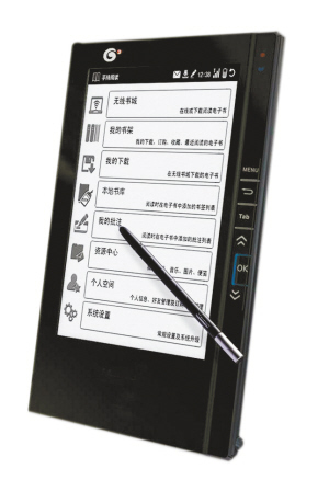 通体白色的机器,屏幕上古雅的国画画面,108种内置正版书,着实吸引了不少人的围观,而这款机器正是由中国出版集团公司推出的电子阅读器,“这款电子阅读器的推出标志着中国出版集团正式进入电子阅读器产业,也是中国出版集团从传统出版集团向新型出版集团迈进的重要一步”。中国出版集团总裁聂振宁说。据现场工作人员介绍,这款电子阅读器包括了中国出版集团的所有图书并都拥有电子版权,可供读者下载阅读。而仗着内容的优势,其阅读器的市场销售价在5000元左右,比市场上流行的阅读器两三千元的价格高出一大截。
