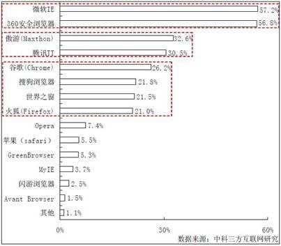 而在诸多浏览器品牌中,360安全浏览器也取得了优异的成绩:过去半年内曾经使用率56.8%,与微软IE的57.2%相差无几,成为中国浏览器的第一梯队;排在第二梯队的遨游和腾讯TT使用率在30%左右;世界之窗(The World)、谷歌(Chrome)、搜狗浏览器和火狐浏览器使用率均在20%-30%之间;而其他浏览器使用率均未超过一成。不过,报告也指出,约76%的网民在过去半年使用过两种以上浏览器,浏览器行业用户转移率较高。