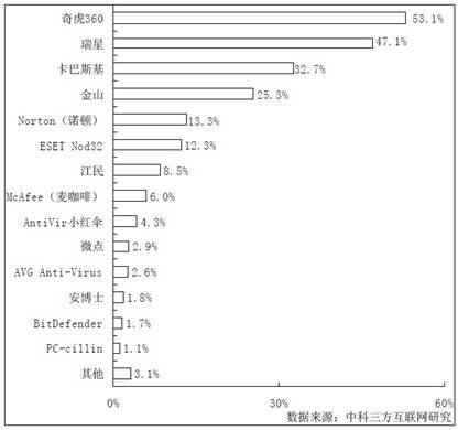 根据本次调查报告,在安全防护领域,360安全产品的使用率超过五成,位列行业第一名。排名第二的瑞星使用率为47.1%,而卡巴斯基和金山的使用率分别为32.7%和25.3%,其他品牌使用率均不到20%。报告指出,国产安全防护软件的用户使用率要高于国外品牌,但是国产安全防护软件品牌较少,故用户选择的空间并不多。同时,360旗下的安全防护软件使用率超越了其他安全软件,成为中国安全防护软件第一品牌。