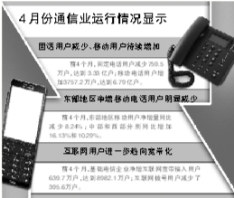 记者昨天从工信部了解到,4月份通信业运行情况显示,我国移动电话用户数量已达到固定电话用户的两倍。(详见上图)。(记者古晓宇)