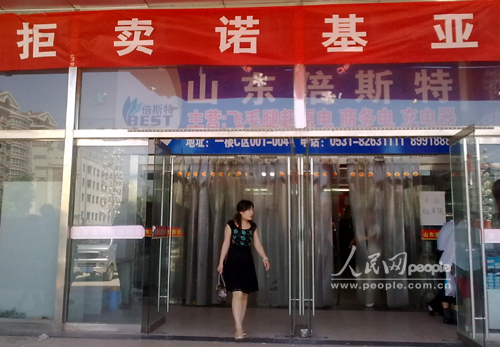 诺基亚与经销商的矛盾持续发酵,迅速在全国各地蔓延。继杭州经销商抗议诺基亚对窜货课以重罚,打出要求诺基亚归还血汗钱的横幅后,今天山东诺基亚经销商再度发飙,在济南市场山东通讯城打出《拒卖诺基亚》的条幅。