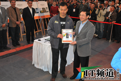 中新网10月30日电 下午6点,中国联通iPhone手机正式在中国市场发售。中国联通副总经理李刚现场售卖第一台iPhone,同时中国联通高层向现场购得手机的第一位机主颁发证书。