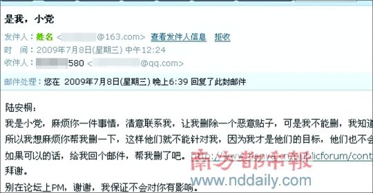 假小党盗用邮箱发给陆安桐要求删帖的邮件。