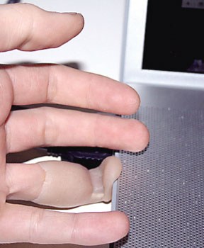 虽然不好看,但是杰里显然十分喜欢这个手指,回家后他迫不及待地把这个U盘从无名指上拔下并插上电脑,给这个U盘下载并安装了Billix,CouchDBX以及Ajatus等软件,完毕后他只用轻轻一拔套上无名指就可以了。