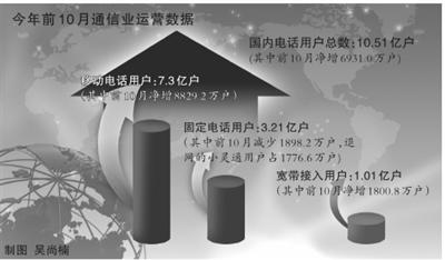 记者昨天(11月22日)从工业和信息化部了解到,截至10月底,我国的电话用户总数已达到10.51亿户。同时,今年累计新增互联网宽带用户1800.8万户,宽带用户总数突破亿户大关。(记者古晓宇)