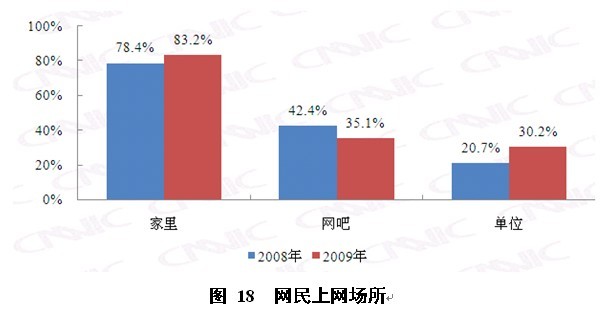 与2008年底相比,在家上网的比例继续提高,已有超过80%(83.2%)的网民在家上网。网吧网民的增速放缓。2009年一年仅增加了850万人,年增长率8%。网吧增速放缓的原因主要有两点:一是手机上网网民规模快速增长。2009年手机网民增长量超过1亿;二是单位上网条件的改善。随着越来越多的单位重视互联网,目前企业接入互联网的比例在逐年提高,吸纳了部分网民上网需求。2009年一年在单位上网的网民数量增加量超过了5000万。