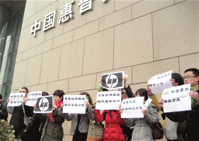 当天上午10点半左右,在国贸桥东南角的中国惠普大厦门前,十余名消费者手举自制的纸牌抗议,引来路人围观。纸牌上写着“蟑螂无罪惠普可耻”、“HP,中国最受鄙视企业”、“惠普之道,以狡辩应万变”等口号。抗议进行了10分钟左右,消费者来到中国惠普大厦的8层,看到“惠普解决方案体验中心”的招牌后,消费者又举起纸牌进行抗议,并要求与售后总监谈判。11点左右,惠普售后总监陈女士来到现场。