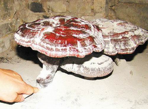 赤灵芝民间称灵芝草。多孔菌科,是一种药用真菌。外形颇似一株五彩蘑菇,“蘑菇盖”呈不规则云朵形,有环纹与辐射状的皱纹相穿插;“盖”的下面有众多的细密菌管孔洞;梗侧生于“盖”下,光泽如漆。每逢夏季,泰山气温渐高,林间相对湿度逐渐增大,阳光散射,形成泰山灵芝迅速生长的有利条件。秋末,可在柞、枫朽木桩旁采到。全株入药,有治耳聋、利关节、保神、益精气、坚盘骨、疗虚劳、滋补强壮等功能。(徐庶)