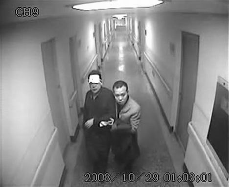 打人者(右)扶伤者就医 (医院提供录像截图)