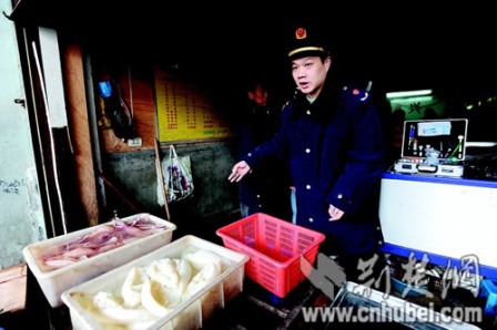 3月8日下午1时,江汉区工商分局副局长高波带领近20位执法队员,来到华南海鲜市场,一一抽查了5家经营水发食品的门面的25个批次产品。结果显示,兴隆冻品商行的鱿鱼涉嫌烧碱严重超标、牛百叶涉嫌用双氧水清洗,惠君海味经营部的鱿鱼和海参涉嫌烧碱超标。