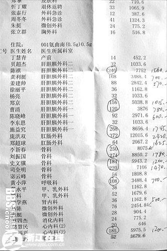 其中18名医生后面,还有手写的数字。发帖者说,这代表这名医生所收的回扣金额。帖子中说,这张清单是他在医院捡到的。