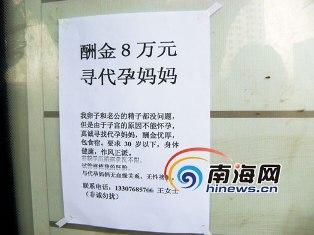 今天下午4点许,南国都市报记者来到海口市海府路汽车东站对面的公交车站看到,在站牌上贴有2张代孕广告,广告大致内容如下:“酬金8万元找代孕妈妈”,因自己子宫问题不能生育,真诚寻找“代孕妈妈”,酬金优厚,包食宿,要求对方年龄30岁以下,身体健康,作风正派。联系人为王女士,手机号码13307685###。