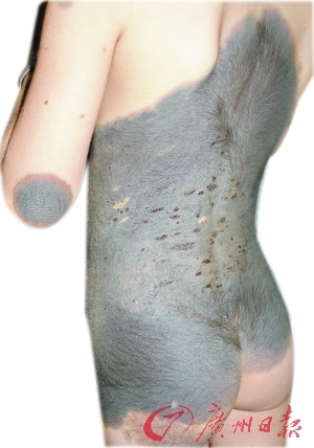 封开县江口镇6岁女童小媛(化名)的身体多处呈大面积黑色,皮肤粗糙,长满长毛。专家称这种怪病(巨大痣细胞痣)属痣的一种,若不及时治疗,可能会癌变。