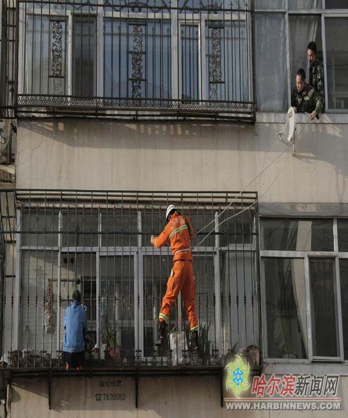 28日14时30分,哈尔滨市道里区工程街12号院内,一名住在6楼的女子从自家阳台处爬出,利用楼下居民家的防盗护栏向下爬至3楼被困。接到报警的消防官兵迅速赶到现场,将被困女子安全送到地面。