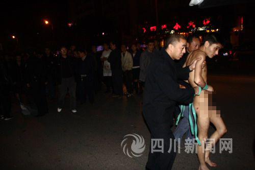 昨日凌晨40分左右,涪城区御营坝邓氏火锅门口围着一大堆人,一名20来岁的小伙正将一辆白色汽车拦在马路中间,神色紧张,情绪激动,并手舞足蹈地口说着什么,特别令人费解的是,该男子身上居然没有一件衣物——完全裸露。其中一名围观的市民说,他和同伴路过此地时,看见这名青年男子正疯狂地拦截车辆,好像很焦急的样子。为了不影响交通以及该男子的人身安全,他便拨打了110。
